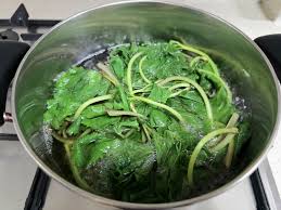 끓는 물에 소금을 한 큰술 넣고 머위를 넣어 1~2분 정도 데칩니다. 너무 오래 데치면 물컹거리고 색이 탁해지니 주의하세요. 데친 후에는 바로 찬물에 헹궈 열을 식혀줍니다. 이렇게 해야 초록빛 색상도 유지되고 식감도 아삭하게 살아납니다.