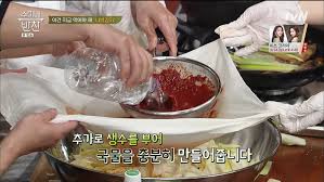 고운 면포나 체에 고춧가루를 담고, 준비한 물(1.5리터)의 일부를 부어 가며 고춧물을 내립니다. 이렇게 하면 고춧가루 찌꺼기 없이 맑고 붉은 국물을 얻을 수 있습니다.