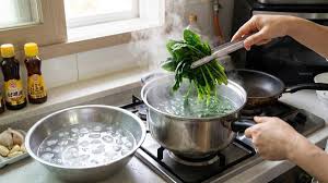 | 2. 시금치 넣기 | 뿌리 부분 먼저 넣고 15~20초 후 잎 부분 넣기 | 줄기와 잎의 익는 시간 차이를 보정 |